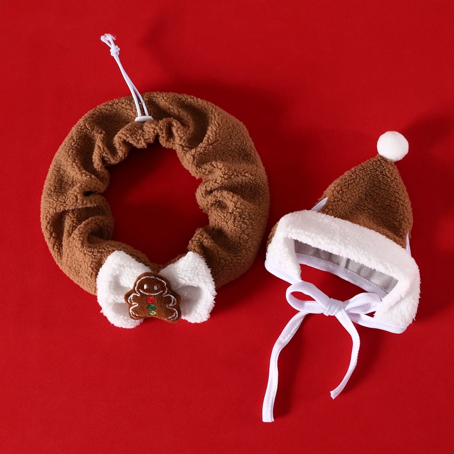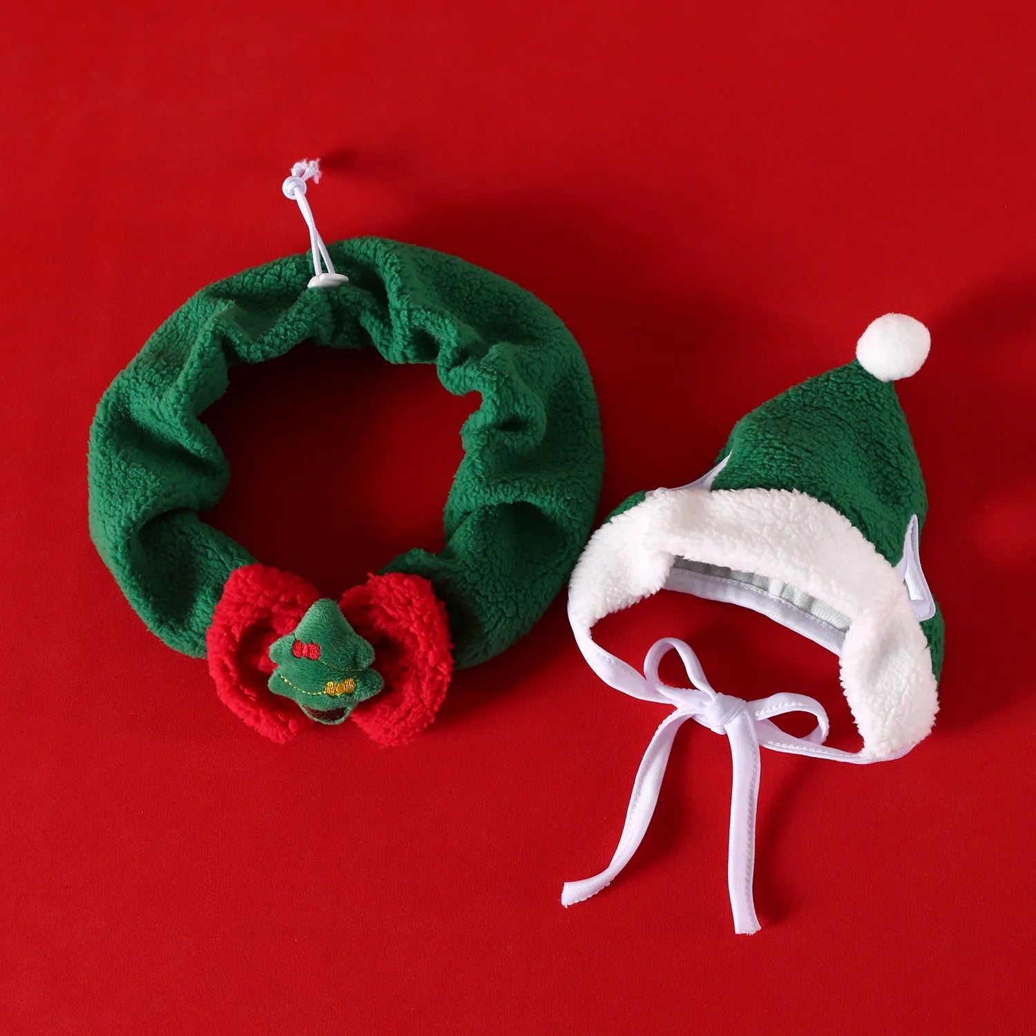 The set includes a plush Christmas hat and matching scarf or neckpiece,